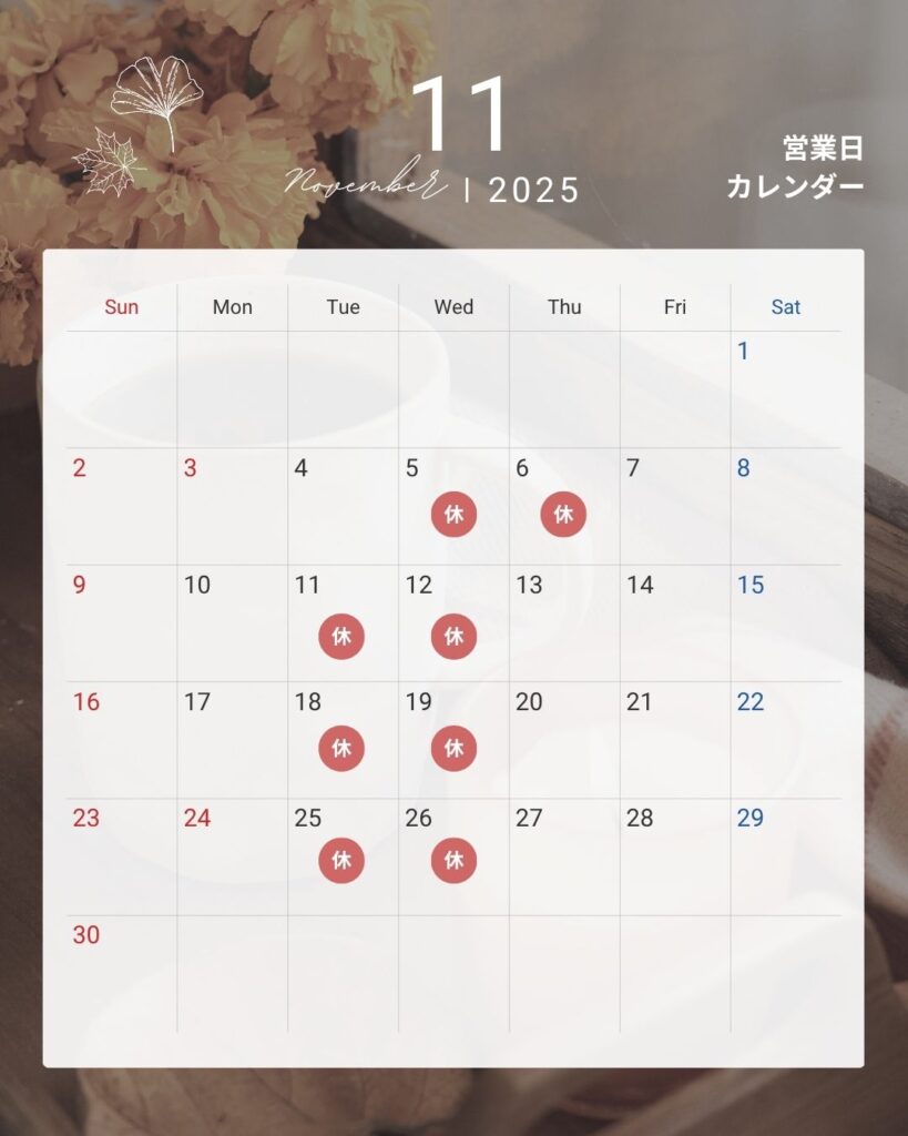 11/6(木)が休業となり、代わりに11/4(火)は営業いたします。